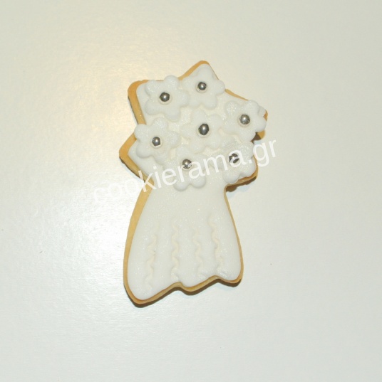 Μπισκοτένια ανθοδέσμη με λευκή ζαχαρόπαστα και ασημί ζαχαρωτές πέρλες.