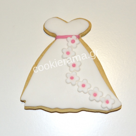 μπισκοτένιο νυφικό φόρεμα, διακοσμημένο με λευκή ζαχαρόπαστα και λευκά - φούξια λουλούδια