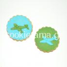 Στρογγυλά μπισκοτάκια με ζαχαρόπαστα και ένα ζαχαρένιο αεροπλανάκι στο κέντρο.
